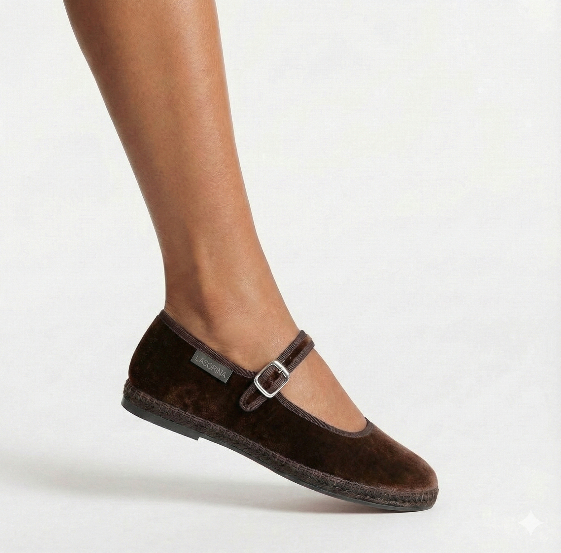 Questa Mary Jane firmata Lasorina offre una rivisitazione moderna della classica calzatura tradizionale. Realizzate in morbido velluto liscio in un colore intenso, queste scarpe presentano una struttura artigianale che unisce comfort e stile. Il design è caratterizzato da una distintiva cucitura in juta intrecciata lungo il perimetro, che collega la tomaia alla suola in gomma, offrendo flessibilità e resistenza per l'uso quotidiano.